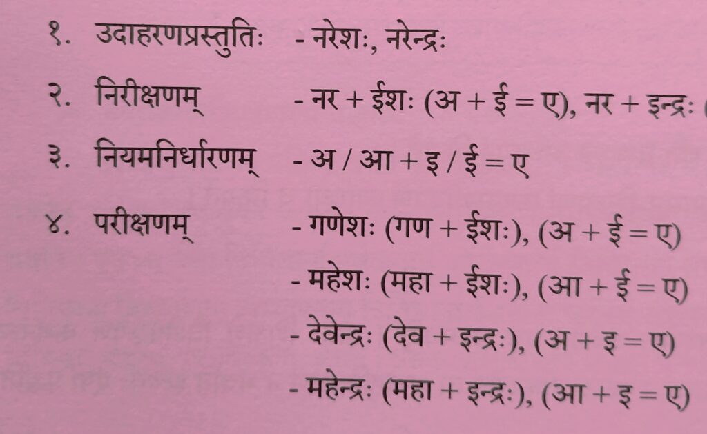 - परीक्षणम्-निर्धारितस्य नियमस्य लक्ष्ये पुनः परीक्षणमेव चतुर्थ सोपानम्। यथा-उपेन्द्र, गंगोदकम्, राजर्षि, इत्यादि नवोदाहरणैः स्वीकृतं नियमं परीक्ष्य प्रमाणयन्ति।